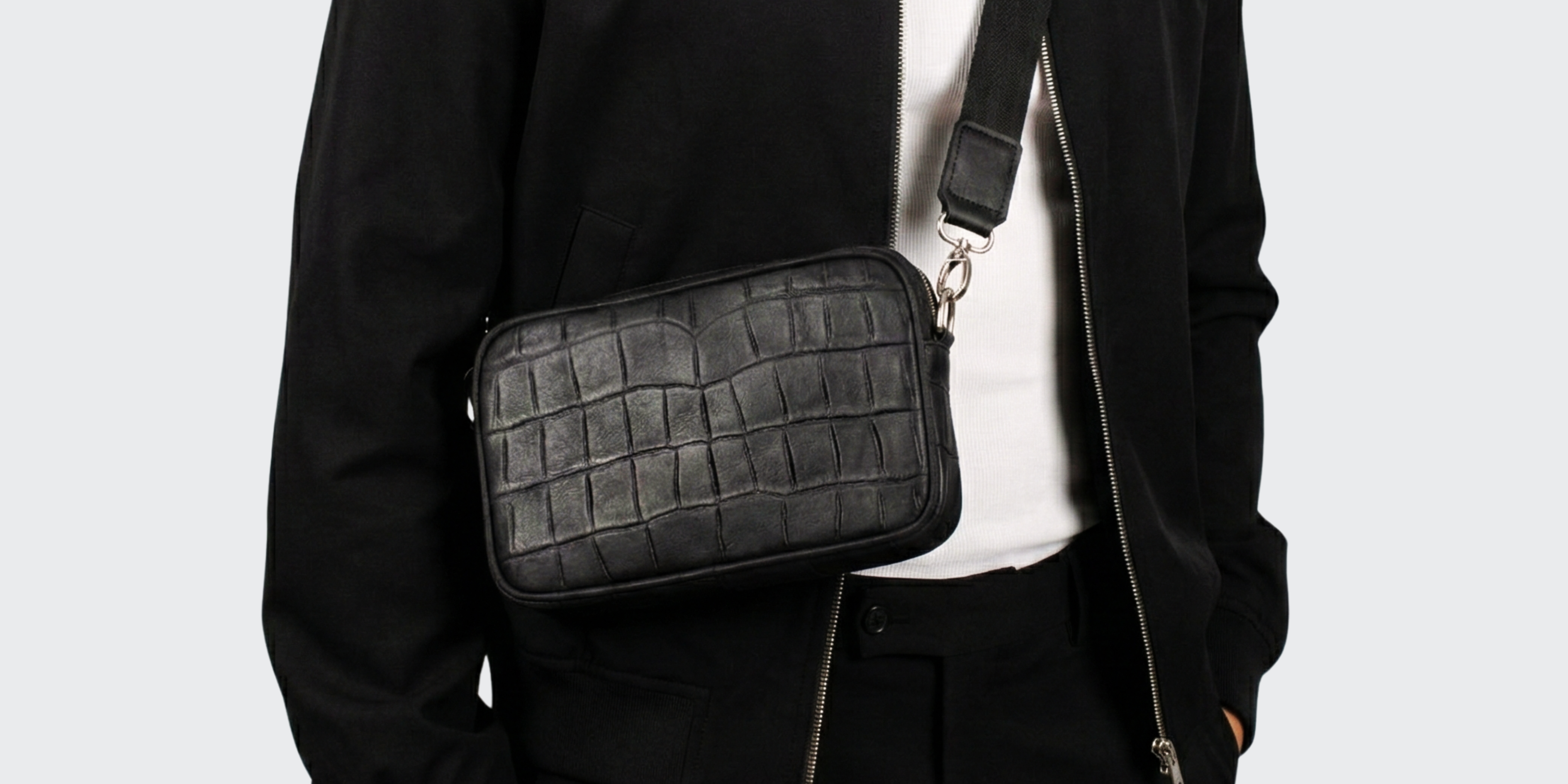 Bolso Cruzado Piel Grabado Cocodrilo Negro