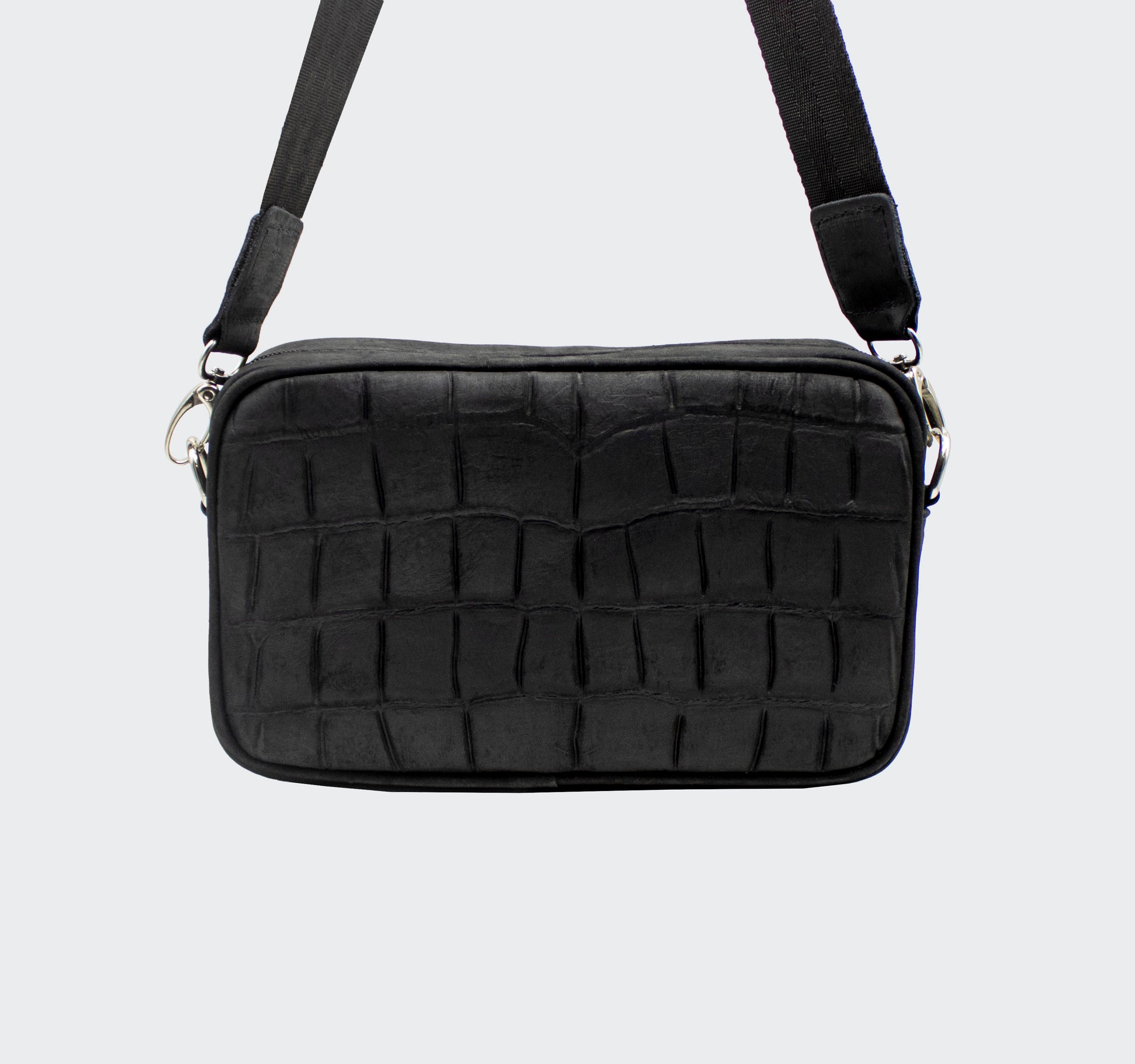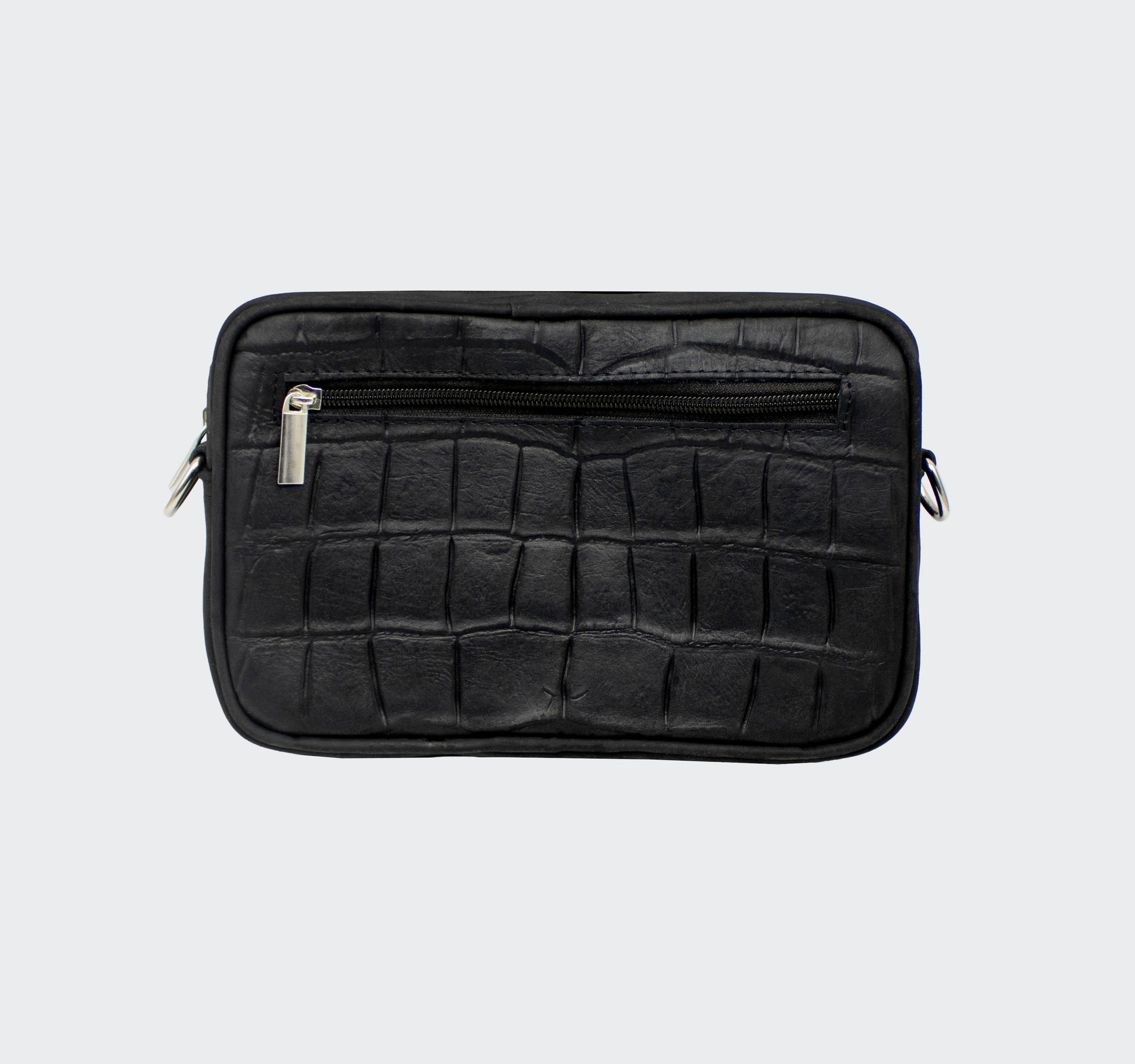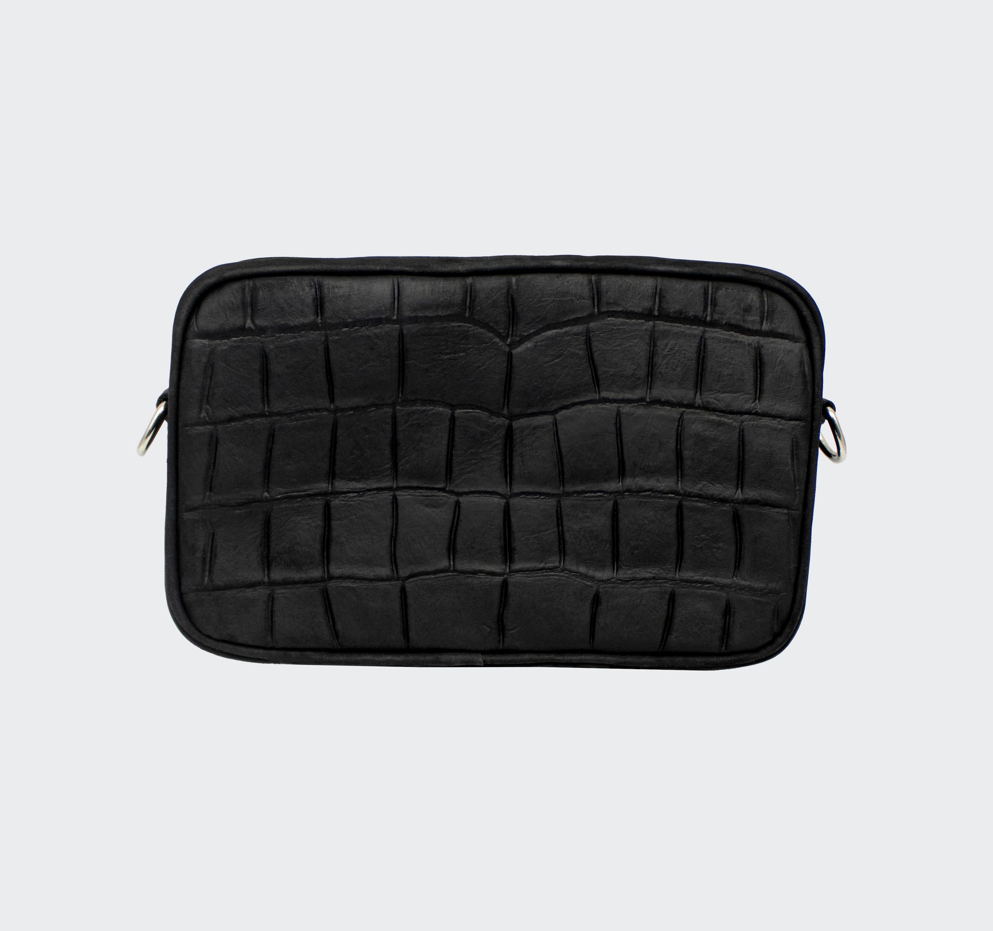 Crossbody unisex hecho a Mano, 100% piel pull up en color negro con grabado de panza de cocodrilo.
