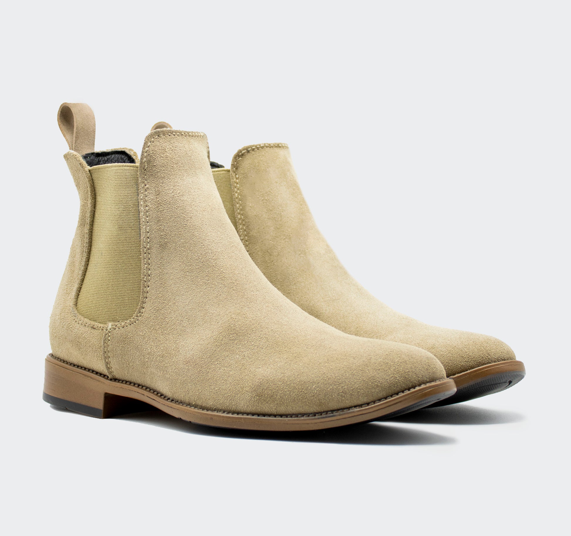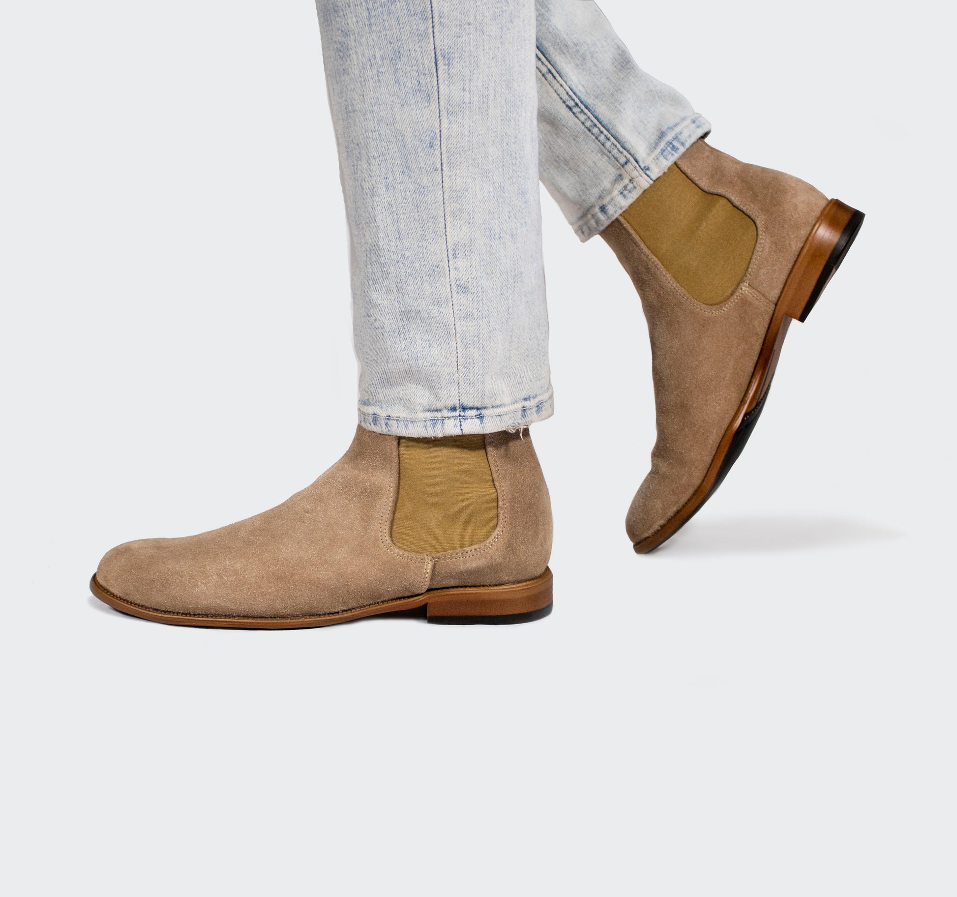 Chelsea Boots gamuza camello para caballero, elaborados totalmente a mano por artesanos del calzado Guanajuatenses.