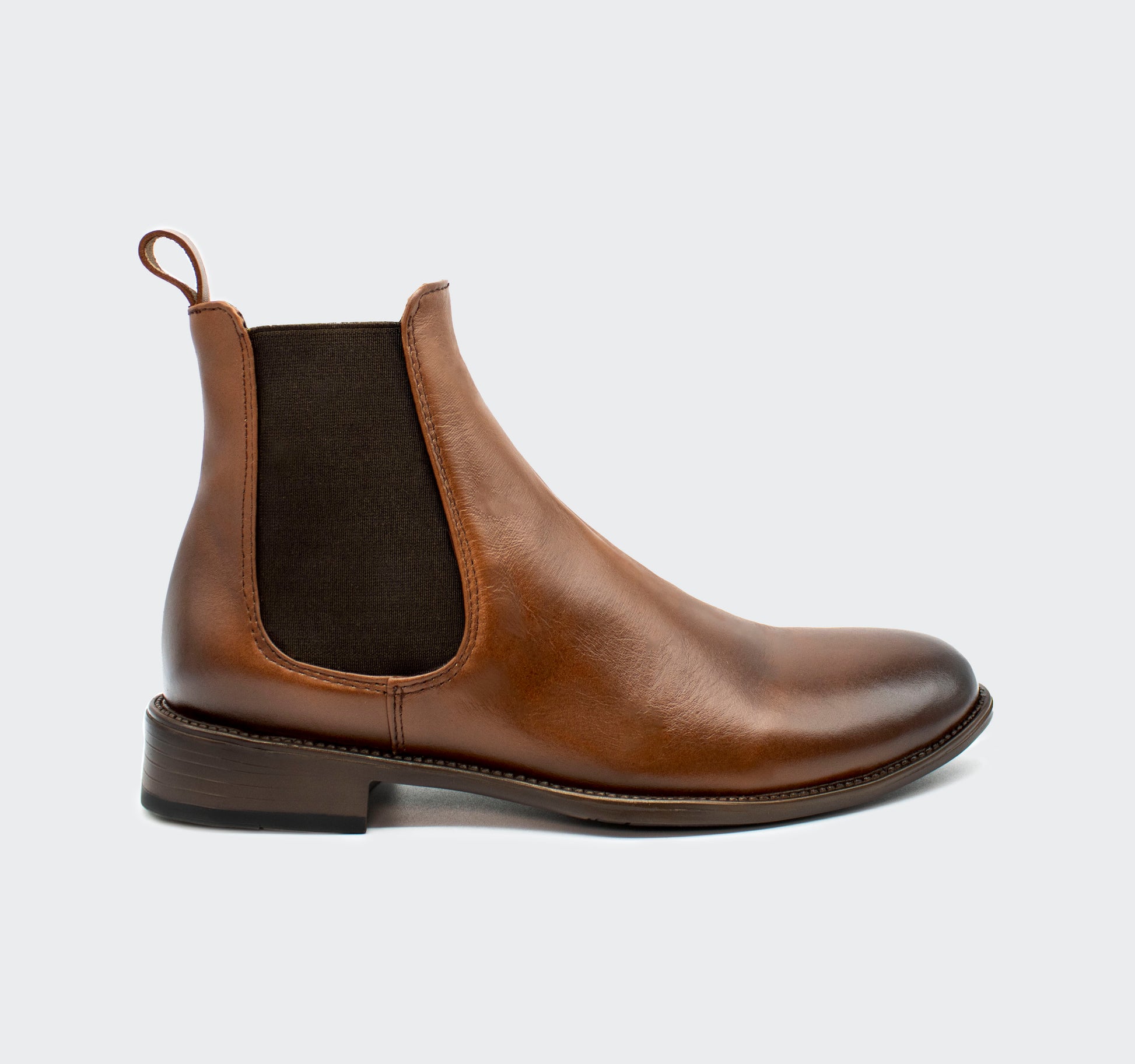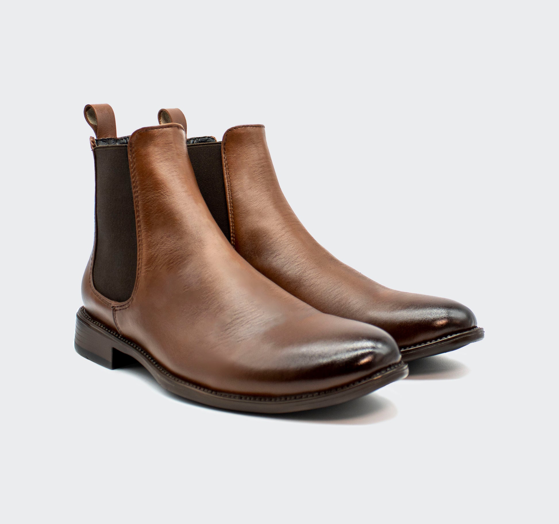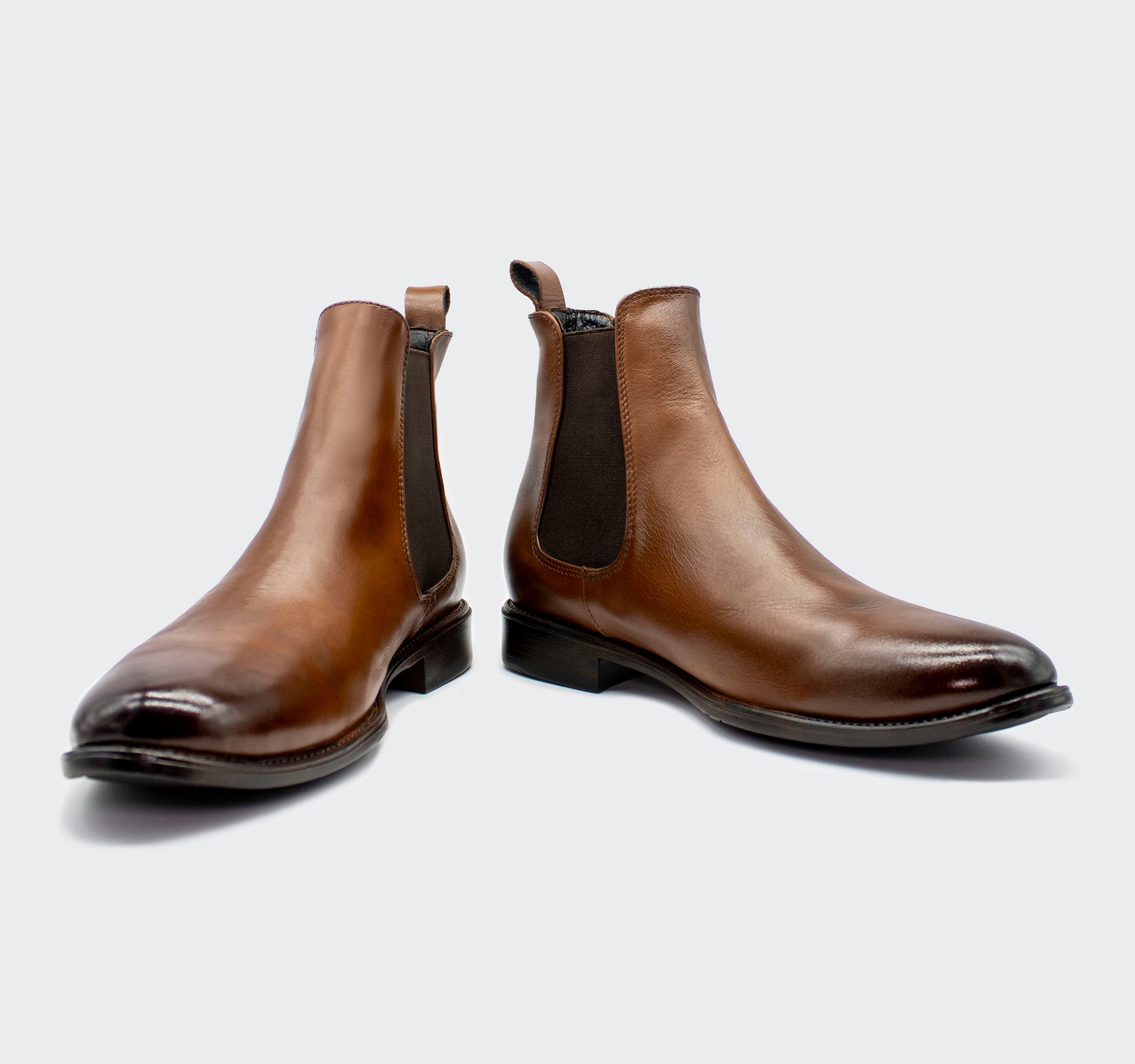 Chelsea Boots piel café con efecto para caballero, elaborados totalmente a mano por artesanos del calzado Guanajuatenses.