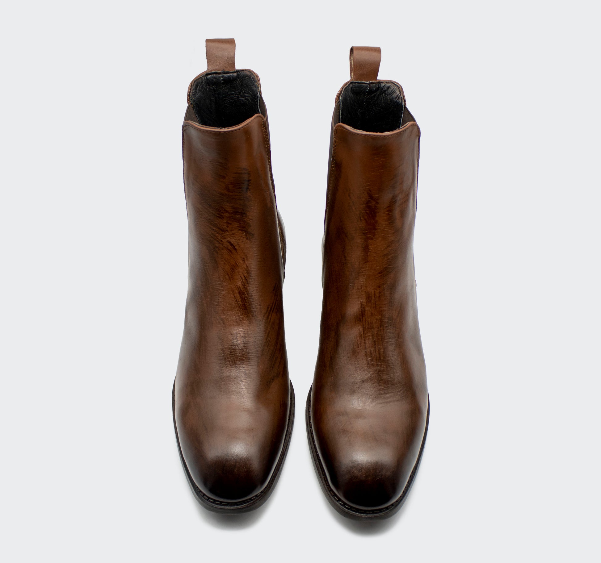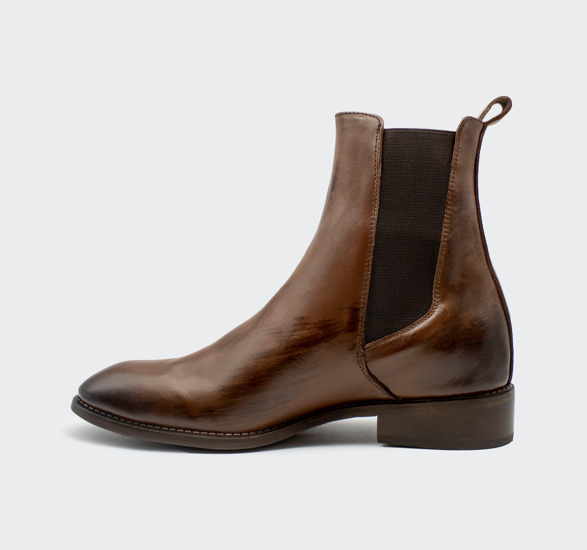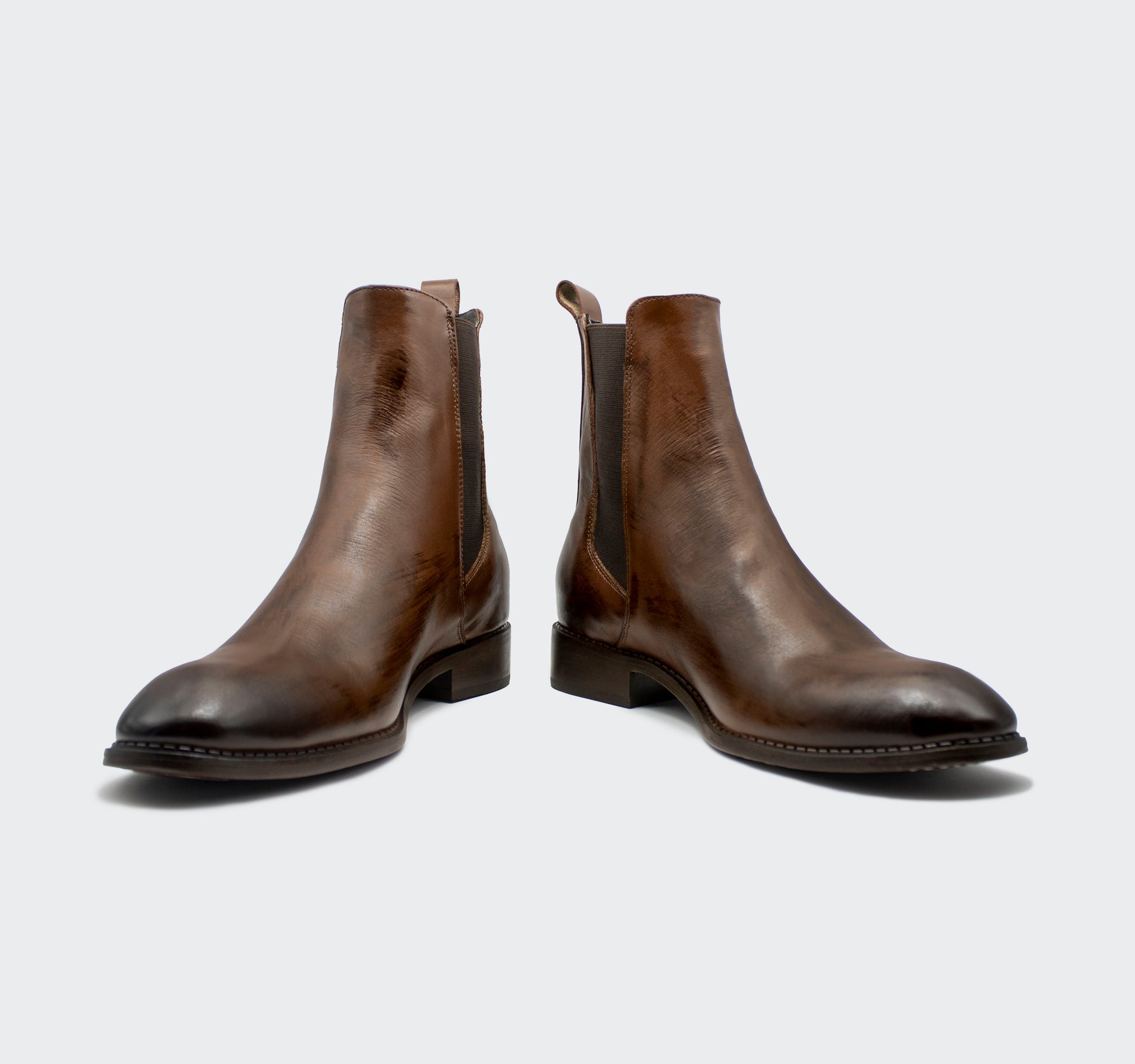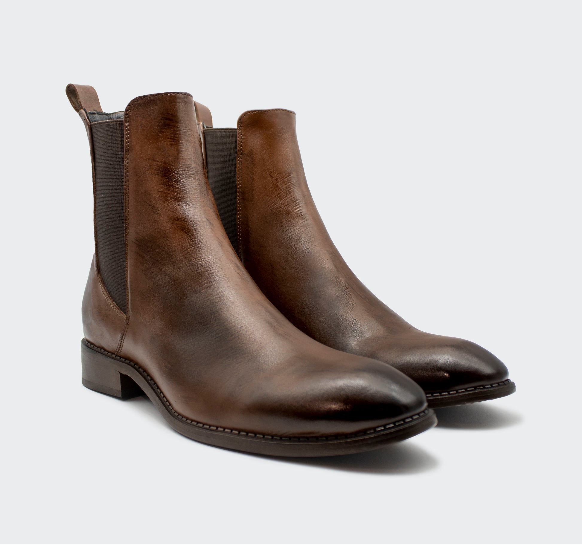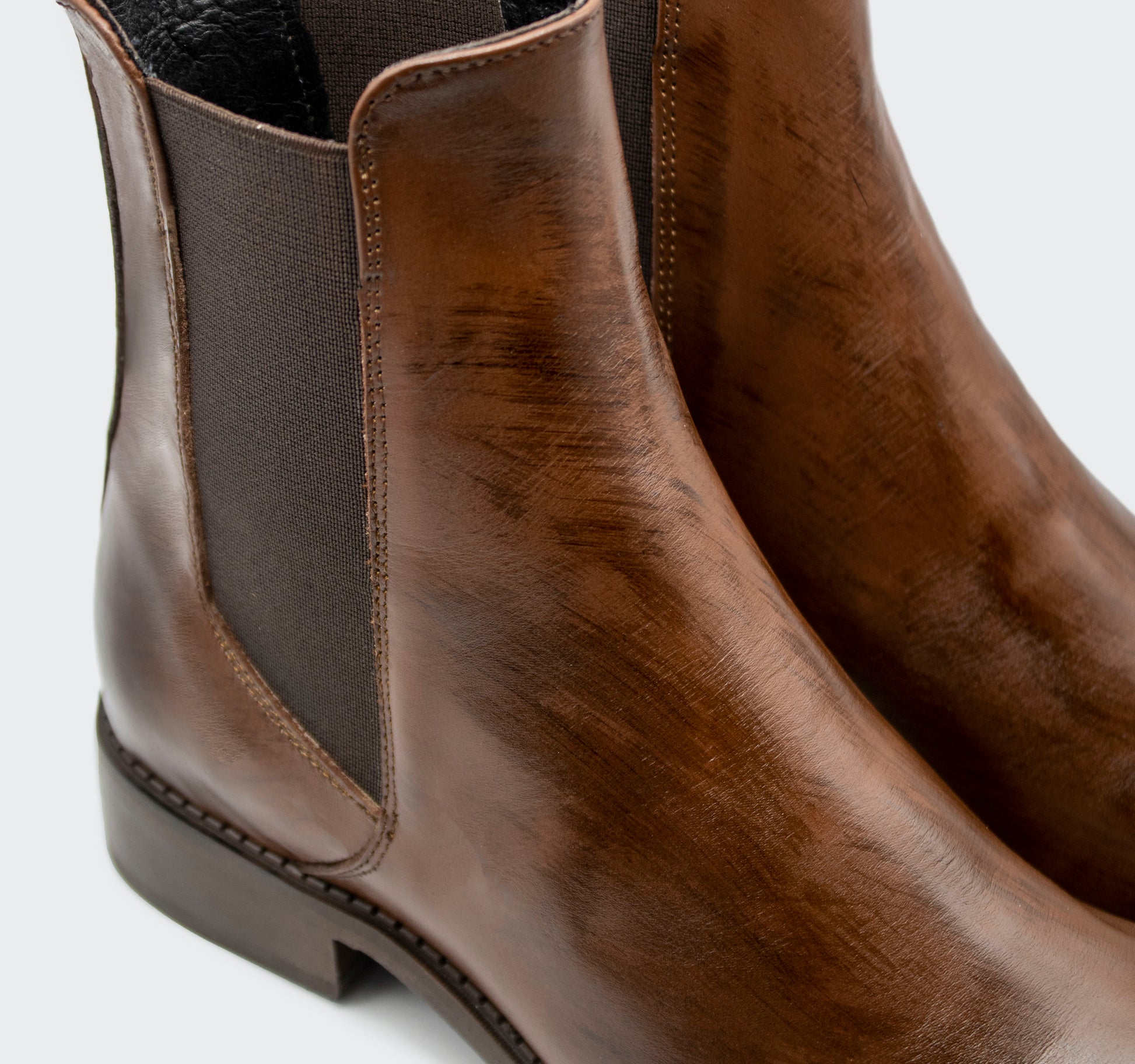 Chelsea Boots Premium piel café con suela de cuero, pintado a mano, con efecto para caballero, elaborados totalmente a mano por artesanos del calzado Guanajuatenses.